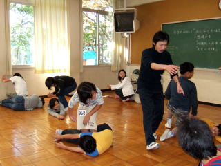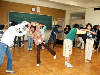 | ウォームアップゲームその3 次は、人間を作りました。「歯医者と患者」では、まずそれぞれが歯医者と患者になった後、「初めての治療でどきどきしている歯医者と、心配している患者」とか「間違った歯を抜いてまった歯医者と、激痛を感じる患者」(右の写真)など、次々場面が与えられ、考えて演じていきます。他に、「犬と飼い主」も演じてみました。 |