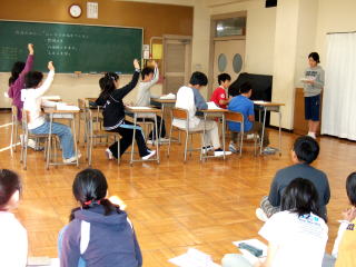 | 演じる側、観る側 子どもたちは、この日取り上げた2つのお話のもと(子どもが書いたもの)をあらかじめ読んでこの授業に臨んでいます。お話を元に作られた台本は、この日の朝に配られました。おおかたの話の筋は分かっていますが、即興でどのような話の展開になるのか自分なりに考えながら、友だちが演じるのを真剣に観ていました。 |