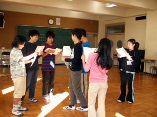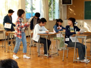 | 「放課後の卒業式」場面2 「何で先生なのに、卒業式をやってほしいと言うのか」 ということを考えながら、台本の続きを即興で演じてみました。それぞれの役の人柄を考えた台詞のやりとりがあり、一人一人がお話の中に入り込んで真剣に考えていました。 |