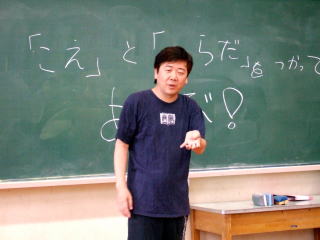 鴻上尚史さんによるシアターゲーム 今日の授業についての説明。 「心の中で思っていることは、声と体を使って伝えるしかない。今日は、声と体を使って表現力をアップするための授業をしようと思っている。ちがうとか、まちがうということはない。正解にたどりつく授業ではない。」 |