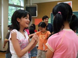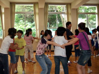 「彫刻家」U できた彫刻をお互いに見合い、気に入った彫刻のところに立ちます。 そこで、彫刻家がタイトルを発表します。 「うーん。」 納得の声が上がりました。 |