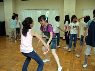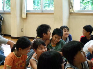 | 声を出す 円形になって、自分の名前を言っていきます。 手拍子に合わせて、テンポよく、リズムよく。 手拍子が男なら1回、女なら2回、ジーパンなら3回、とだんだん難しくなっていきました。 |