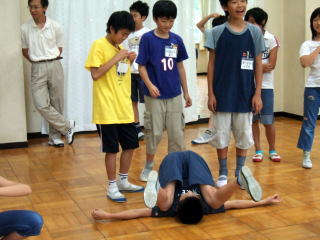 | からだで遊ぶ 「彫刻家」T 二人組になって、一人は素材、一人は彫刻家になります。 素材に色々なポーズをつけ、タイトルをつけます。 素材は、彫刻家の言うがまま、されるがまま。 |