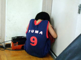 | 「彫刻家」V 今度は、与えられたタイトルで彫刻を作ります。 この彫刻のタイトルは「悲しみ」。 教室の隅にうずくまる素材。 他にもいくつかのタイトルが与えられましたが、 意外と「すっげえ嬉しい」というタイトルに悩んでしまった子どもたち。 |