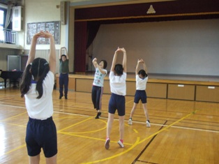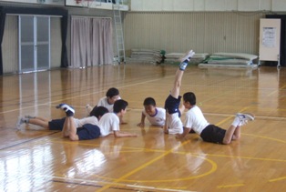 | 準備運動も、いつもと様子が違います。 音楽をかけながら、 体の各部分を伸ばすような運動が 続きました。 最後に両手両足をぶらぶらさせる 「ごきぶり運動」でリラックス。 ダンスの準備は万全です。 |