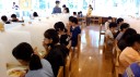 こども笑顔のラインプロジェクト(文部科学省、環境省後援)により、子供たちは犬とどうやったら仲良くなれるか、ふれあいながら考えました。いろいろな種類の犬が6匹来てくれて、子供たちが足の肉球や鼻に触ってもおとなしくしていました。子供たちも優しく犬をなでたりそっと抱っこしたりして、上手にかかわることができました。聴診器で犬の鼓動を聞き、犬も生きていること、気持ちがあること、相手の気持ちを考えることが大事だと、子供たちは犬とふれあいながら感じたことでしょう。 |