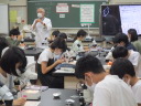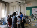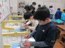 集気びんの中に入れたろうそくの炎が、2回目はすぐ消えてしまいました。そこから、ものが燃える前の空気と後の空気には、どのような違いがあるか問題を作った6年生の子供たち。酸素が減って二酸化炭素が増えたのではないか、と今までの学習から予想しましたが、さて、割合は?教師の演示実験を集まらないでも見えるよう工夫し、ICTも活用して授業を進めます。そして、いよいよ子供たちが石灰水や気体検知管を使って実験開始です。 |