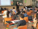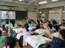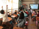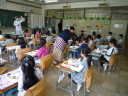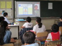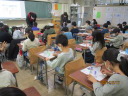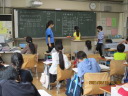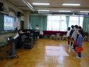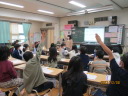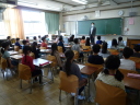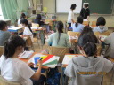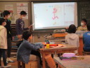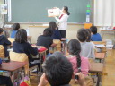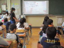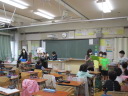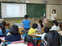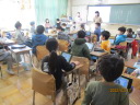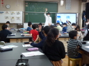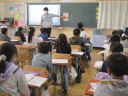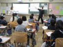 5・6年生は外国語を週2時間学習します。担任とJTEの先生が協力して指導します。子供たちは、あいさつから英語で話します。リズムに乗って発音したり、二人ペアで会話したりして、楽しく学習に取り組んでいます。 |