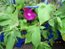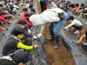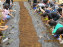 先週、地域支援本部の方と保護者の方にもご協力いただいて先生方が八成ファームの畑を耕しました。そして、昨日は1年生、今日は2年生がサツマイモの苗を植えました。まっすぐ下に向けるのでなく、横に寝かせるように植えます。今日はあいにく雨が降り出し大急ぎの苗植えでしたが、うまく根が伸びて育ちますように。 |