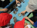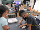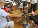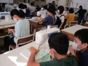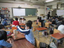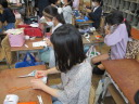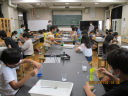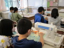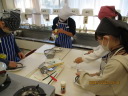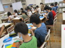電動糸のこぎりの安全な使い方をしっかり守って、子供たちは気持ちを集中させて真剣に板を切っていました。カーブした切り方も、細かい切り込みの入れ方も、とても上手です。切り込みにぴったりと組み合わせて、バランスを考えています。色の塗り方も丁寧で、作品作りに没頭していました。授業の振り返りをして、次回はいよいよ仕上げです。子供たちの個性的あふれる作品の出来上がりが楽しみです。 |