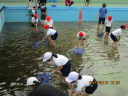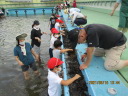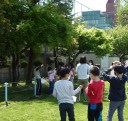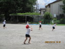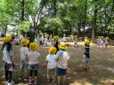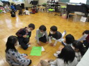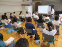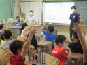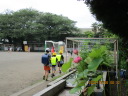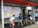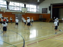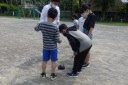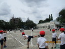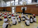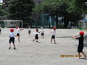 プロ野球チーム読売ジャイアンツのコーチをお招きし、ボールの投げ方を教えていただきました。「頭の上でトントン、そのまま上から腕をクルッ!」大きく遠くへ投げる練習の後は、守備チームと攻撃チームに分かれてゲームです。味方の取りやすいボールを投げること、「思いやりが大切」と教わりました。終わった後は「楽しかった!!」。プロのコーチに教えていただき、どのクラスもあっという間の1時間でした。 |
