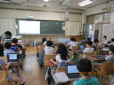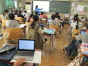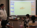 一人1台のタブレットは、絵や図で表現する学習活動にとても役立ちます。今までは切り取ったり貼り合わせたりしていた作業が、画面の中で思いのままに動かすことができます。余計な時間を使わず、学習のねらいに十分な時間をとれること、互いの考えを交流しあえること、そのため子供たちの思考力や表現力を伸ばすことができます。写真は、4年生外国語活動でWhat