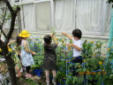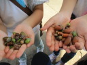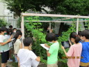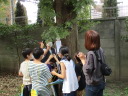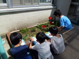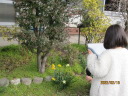 校庭で春を探して、カードに記録しました。「サクランボができている!」「フジの花がブドウみたい」「芝生の手ざわりが冬のころと違う」「春の風が気持ちいい」など、子供たちは五感を働かせて春を見つけていました。八成小学校の校庭は、いろんな木が植えてあって緑豊かです。 |