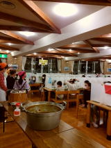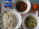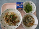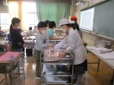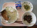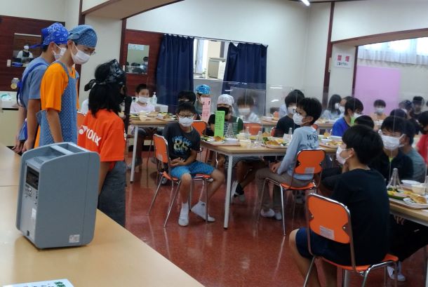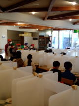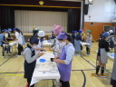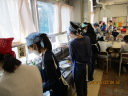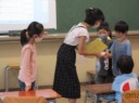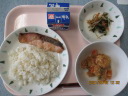 1年生は、今日から給食が始まりました。手をきれいに洗い、先生の話をよく聞き、しゃべらずに並んで給食を受け取ります。給食当番になった子供たちは、白衣に着替えて真剣に仕事をしています。子供たちは安全に食べるためのルールを覚えていきます。担任の先生と専科の先生と栄養士の先生が見守り、無事配膳が終わりました。