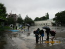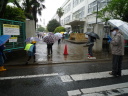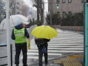 4月になって初めて朝から本降りの雨です。正門でも南門でも、いつものように子供たちの見守りをしていただいて、安全に登校できています。今日は校庭で待機せず、みんなスムーズに昇降口に入っていきます。さて、1年生にとっては傘を閉じたりレインコートを脱いだりすることも、試練です。6年生が1年生の支度を手伝ってくれて、うれしいですね。 |