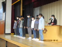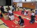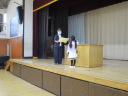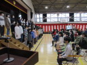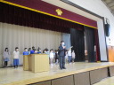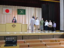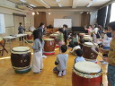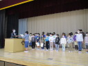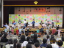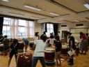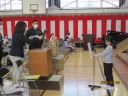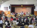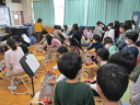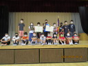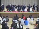 今まで休み時間に、自分たちから進んで練習してきた太鼓クラブの子供たちです。発表したい、太鼓クラブの部員を集めたい、という思いをもって、迫力ある演奏を披露してくれました。そろいの法被を着て、豆絞りを頭につけ、フォーメーションの変化も工夫を凝らしています。聴きに来た子供たちも、先生方も、演奏に引き込まれていました。 |
