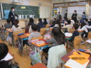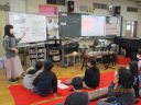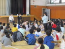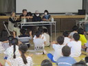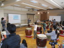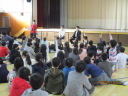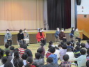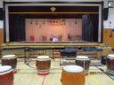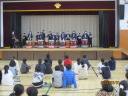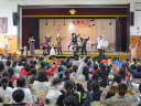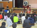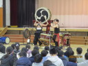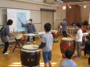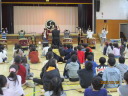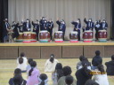 太鼓演奏のプロ塚本さんをお招きし、いろんな太鼓を演奏していただきました。特に、大太鼓は昨年の大会で日本一を獲得した腕前、大きな音から小さな音まで素早いばちさばきで力強い演奏でした。篠笛や三味線と合わせたり、子供たちも一緒に太鼓をたたいたり、伝統楽器の音色を体を揺らしながら楽しく聴いている子もいました。 |