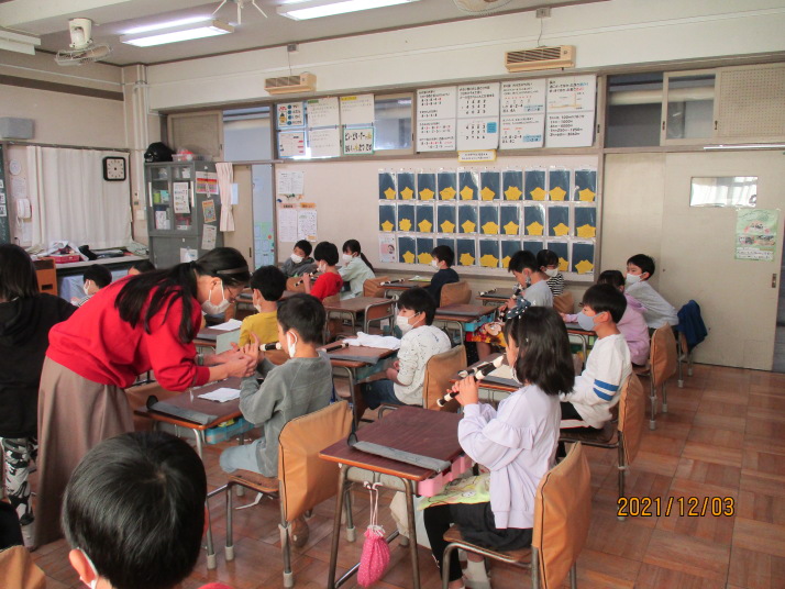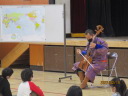 2年生は、馬頭琴の演奏を聴きました。エルデンさんはモンゴル出身の方で、楽しく話しながらいろんな曲を弾いてくださいました。国語の「スーホの白い馬」で出てきた馬頭琴の音色を実際に聴き、子供たちはリズムに合わせて手拍子をしていました。