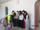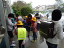 お姉さんに迎えてもらい、1年生は八成小学校の仲間入りです。 |
