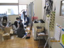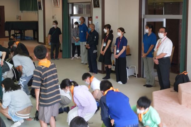 地震が起きた時、「落ちてこない、倒れてこない、動いてこない」場所を素早く探し、ドロップ(低い姿勢)、カバー(頭を守る)、ホールドオン(動かない)の態勢をとること、を指導しました。教室では机の下にもぐり、机の脚を持って動かないように頭と体を保護します。いつ起きるかわからない地震に備え、身を守る行動に結びつくよう訓練します。