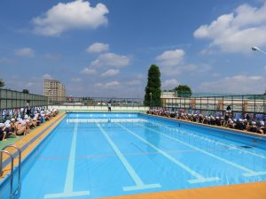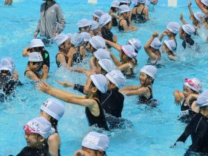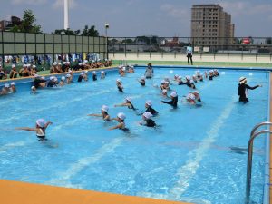 晴天のもと楽しみにしていた小学校初めての水泳学習が始まりました。始めに校長先生からのお話を静かに聞き、シャワーを浴びてからプールに入りました。友達と水のかけ合いっこをしたり水の中を走ったりして楽しみました。安全に気を付けて水泳の学習を進めていきます。