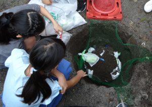 16日(火)、学校支援本部の方々にお手伝いいただき、総合的な学習の時間に「ごみ埋め実験」を行いました。