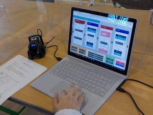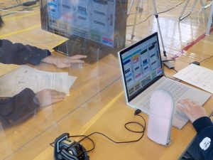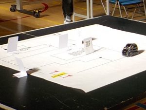 AIロボット授業では、グループに1台の自走式小型ロボットとノートパソコンが配置され、配達の課題に従って、地図上の各地点をまわるプログラム作ります。プログラムが完成したら、それをロボットに転送し、思い通りの動きとなっているか確かめます。