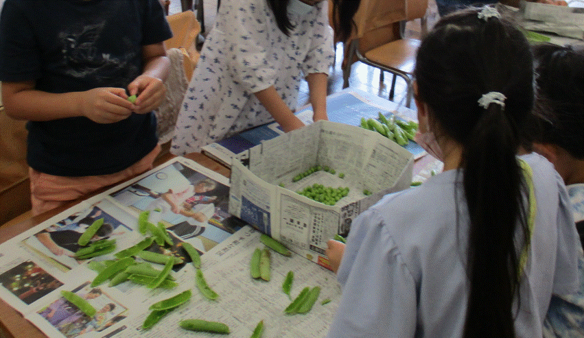 春が旬のグリンピースのさやむきをしました。少し力を入れてさやを押すと・・・中からまあるいグリンピースが顔を出しました。一つのさやにたくさんの豆が入っていることに気付き、一粒一粒大切に取り出しました。むき終わったら、給食室まで運び、最後は全校でおいしい「ピースご飯」としていただきました。
