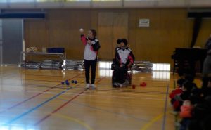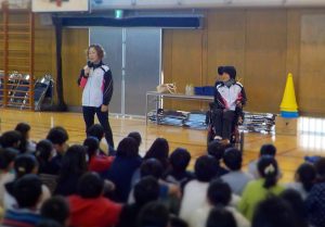 3月9日(土)、オリンピック・パラリンピック教育のひとつとして、『ボッチャ』でロンドンパラリンピックに出場されている秋元選手と渡辺コーチをお招きし、お話を伺いました。また、一人ひとりがボッチャを体験することも行いました。