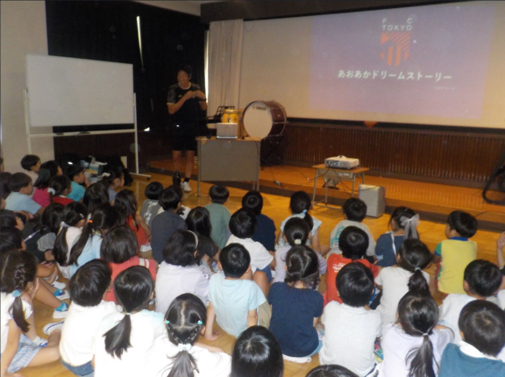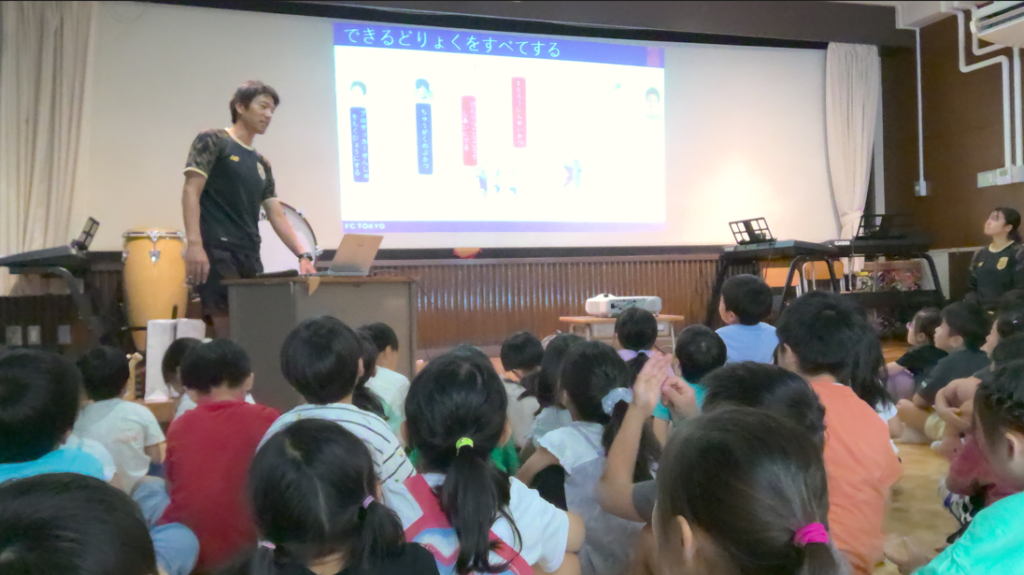 FC東京さんからコーチをお招きして、将来の夢をかなえるためのお話を伺いました。コーチの体験談をもとに、「あきらめない」「じぶんをしんじる」「できるどりょくをすべてする」ことの大切さを教えてくださいました。うまくいかないことがあっても、最後まで頑張ったからこそ、夢をかなえることができたという素敵なお話でした。質問にも答えてくださり、ありがとうございました。