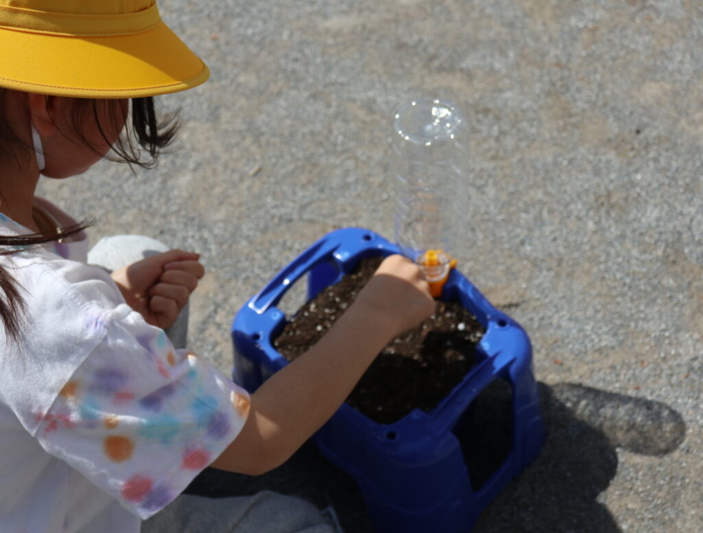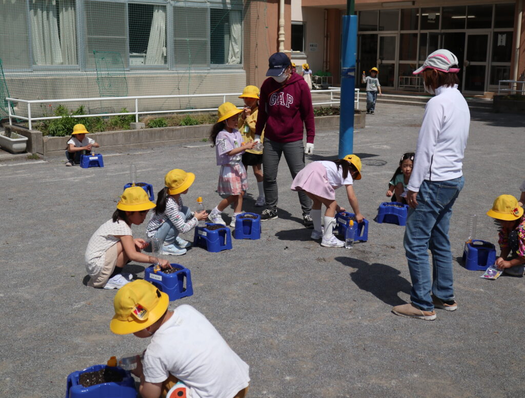 1年生が生活科で育てるあさがおの種まきをしました。プランターに土をいれ、種をまいていきます。学校支援本部の皆さんがお手伝いをしてくださいました。「どんな色のあさがおがさくかな?」「あおがいいな」、そんな声が聞こえてきました。
