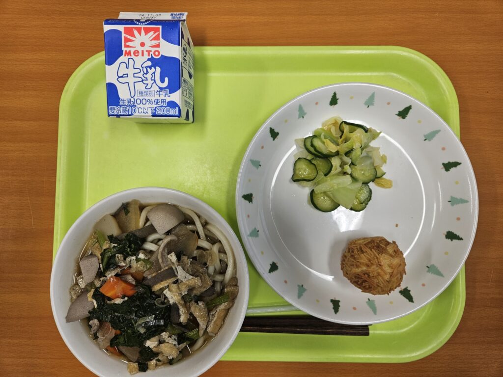 今日の給食のメニューは、【けんちんうどん キャベツとキュウリのあさづけ いがぐりあげ 牛乳】です。メニューの一つに【いがぐりあげ】とありますが、いったいどんな料理なのでしょうか。これは、「『栗🌰』に見立てた、さつまいも料理」なのです。『いが』にあたる部分に細かく切ったそうめんを使用し、『栗🌰』にあたる部分はスイートポテトのような芋あんのまわりにまぶして揚げたものです。栗をがぶついて食べているようなイメージですが、中身は栗よりも甘いスィートポテトなので、とても美味しいです。若者の言葉でいうなら、きっと『バズる』と思います。