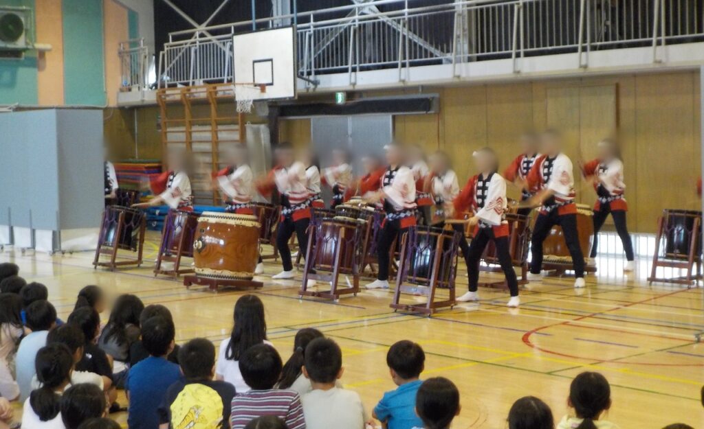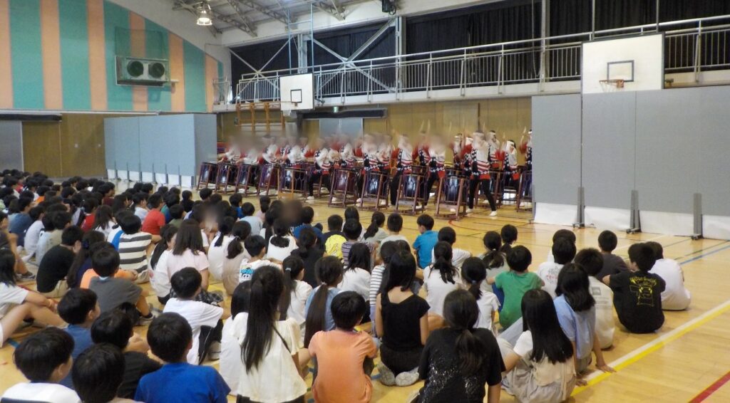 体育館の音響がよく、聴いていた児童は床からも伝わる力強い響きを感じ取っていましたが、演者である明星学園の皆様ご自身も自分たちの音の響きに驚いていたようでした。全国大会で数々の賞をいただく常連校で、定期的に地域や小学校向けに演奏会をしながら日々技を磨いているそうです。練習では筋トレなども行うようで、力強さの中にも繊細で小気味よいリズムが表現できるための練習量もすごいのだと思いました。