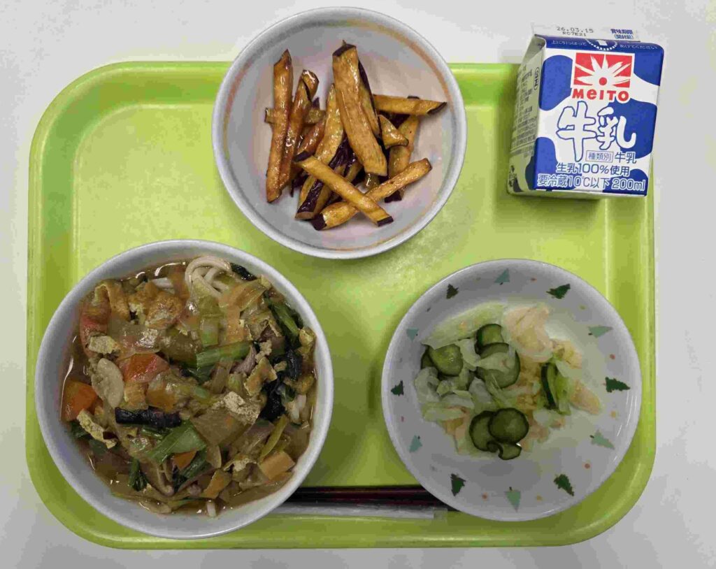 「卒業前に、もう一度食べたい」リクエストメニューの第2弾は「いもけんぴ」。渋すぎるメニューが登場しました。第1弾は主菜でしたが、今日(3/10)は副菜。おやつに極めて近い(笑)感じもしますが、食物繊維が豊富で、お腹の調子を整え、エネルギーも補えるので副菜としても十分です。今日はいもけんぴの他に「キャベツときゅうりのあさづけ」も副菜としてメニューに加わり、バランの良い献立となっています。【献立:カレーうどん いもけんぴ キャベツときゅうりのあさづけ 牛乳】今日もおいしくいただきました。(画像は、本校備品のオリンパス製校長用デジカメで撮影しています。)