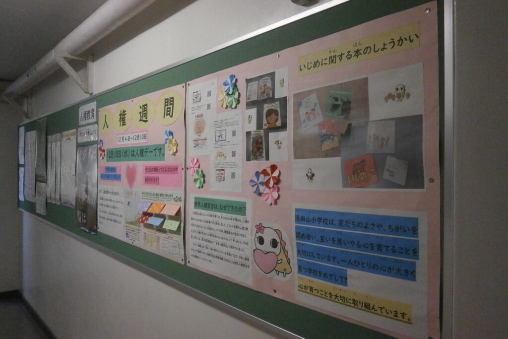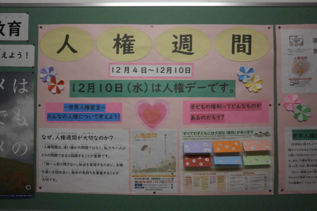 77年前に世界人権宣言が採択されたのが12月10日。この日を最終日として、毎年12/4から12/10までを法務省は『人権週間』とし、人権擁護、人権教育に関する様々な啓発活動を行っています。本校でも今年度は【人権集会(オンライン)】で人権啓発に関する本の朗読を行い、廊下には人権教育関連の啓発用掲示物(画像1、2枚目)も多く設置しています。12/10の研究授業では6年生が『世界人権宣言』に関する題材をもとに、人権問題について考えました。人権は英訳すると【human rights】ですが、複数形Sの意味に気づいた児童がいました。もともとはいろんな権利があるということでの複数形なのだと思いますが、「人権は自分だけでなく、みんな(複数)にある。」という、素敵な解釈をする児童もおり、誰にも人権はあるということを学び直すいい機会となりました。