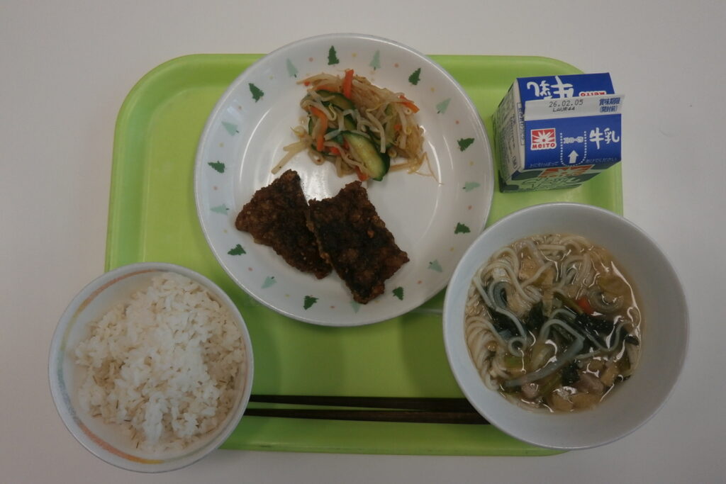 最終回(1/30)のテーマは『昔の給食』。食糧難時代は豚肉や鶏肉が希少で、代わりに栄養価が高く安価だった『くじら肉』が学校給食で提供されていた時代もありました。今日は昭和世代には懐かしい、クジラ肉の竜田揚げがメニューに登場しました。牛・豚・鶏の肉に比べ、クジラの肉はタンパク質や鉄分が高く、脂肪は極めて少ない(100グラム当たりの含有量で、牛肉の約64分の1、豚肉の約14分の1)、すごいお肉です。全国学校給食週間中、いろんなメニューを考案、調理してくださった栄養士さんと調理員さんに感謝申し上げます。今日もおいしく、そしてありがたくいただきました。今日の献立【麦ごはん くじらの竜田揚げ よしのじる もやしの梅肉和え 牛乳】(画像は、学校備品のオリンパス製校長用デジカメで撮影しています。)