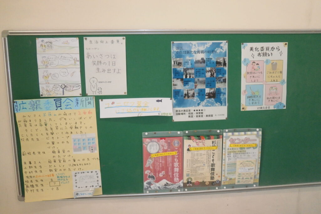 新しい記事を掲示する、読み仮名をふる、人が大勢通るような場所を選ぶなど、各委員会の児童はいつも考えて掲示、広報活動をおこなっています。声や映像でも発信できるようになると、より周知ができると思います。(画像は、学校備品のオリンパス製校長用デジカメで撮影しています。)