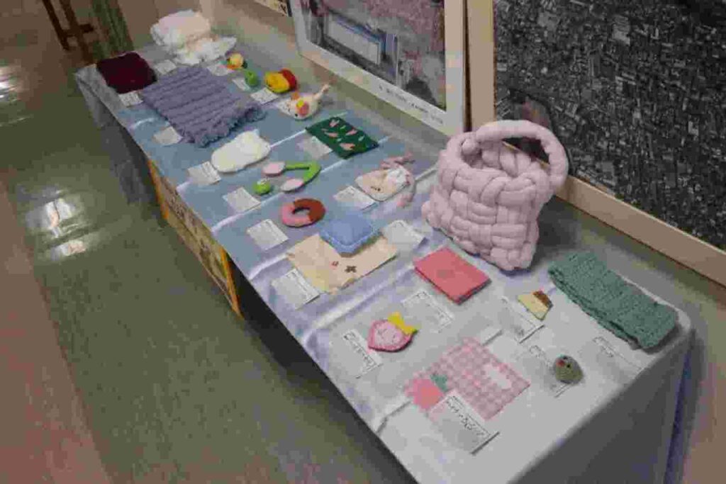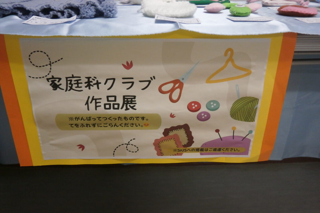 授業の裁縫教材とは違い自由度が大きいので、個性豊かで発想力に富んだ作品が並んでいます。保護者の皆様は、道徳授業地区公開講座ならびに保護者会へのご来校時に、北校舎1階までぜひお越しくださるとありがたいです。(画像は、オリンパス製校長用デジカメで撮影しています。)