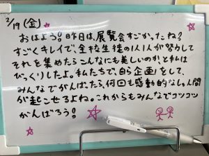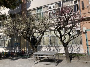 - 展覧会開催中の学校の様子をお知らせします。校庭には1月終わりから紅白の梅の花が咲きだしました。