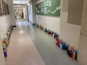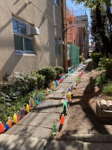 18日(木)より展覧会が始まりました。西門を入り体育館へ向かう道には、大小様々なペットボトルに入った色水がご案内するように置かれています。1年生の装飾作品「色水・キレイ」です。色づくりを楽しみながら作った様子が窺えます。