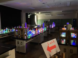 南校舎第二理科室です。ブラックライトとLEDを使った6年生の作品展示です。