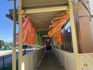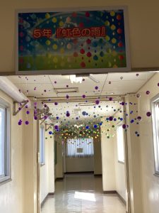 南校舎への渡り廊下は「レンインボートンネル」になっています。4年生の装飾作品です。レインボー色の色合いとともに風に吹かれサラサラと鳴る音も楽しめます。