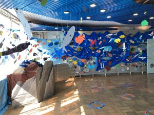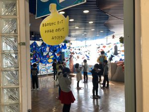 ここは、2階のランチルームです。2年生の装飾作品「さかさま?海の世界」中で鑑賞中の1年生が鏡を持ち「うぁーすごい。」と声を上げながらさかさまの世界を楽しんでいました。