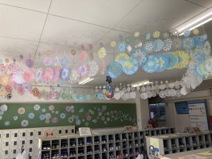 第二昇降口に戻りました。6年生の装飾作品「星・雪・華」です。頭上に美しい自然を模した光景が広がっています。