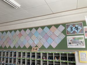 第一昇降口には、3年生の装飾作品「和文様イイ感じ」が飾られています。和紙に様々なパステルの色染めがされ華やかな雰囲気になっています。
