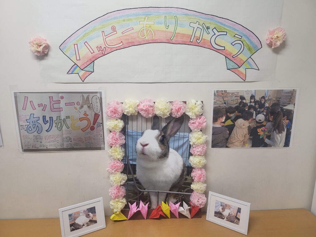 昨年11月、本校展覧会の成功を見届けるように、展覧会終了後すぐにハッピーは旅立ちました。人間の年齢でいうと100歳を超えているらしく、大往生、天寿を全うしたということになるかと思います。旅立ち後は全校児童、教職員、そして地域の方々も悲しみに暮れてばかりでしたが、もともと暮らしていた籠のそばに画像のような祭壇をつくり、改めてみんなでお悔やみを申し上げるとともに、在りし日のハッピーの思い出に浸ることができました。