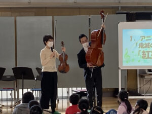 日本フィルハーモニー交響楽団演奏会 10月28日(木)、日フィル楽団の4人の方が来校し弦楽四重奏の演奏会が行われました。コロナのため、高学年の部では6年生が、低学年の部では3年生が体育館で演奏を聞き、その他の学年へはteamsで配信しました。 コメントは受け付けていません。 先生たちの授業研究会 クラブ活動