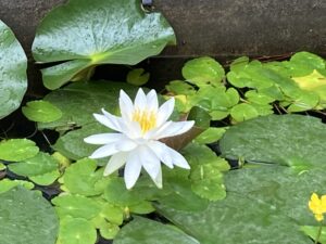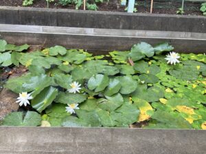 校長室前の池に毎年この頃咲く白い花のスイレンと黄色い花のアサザ です。