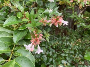 アベリアです。白ピンクの小さい花です。ビオトープにあります。