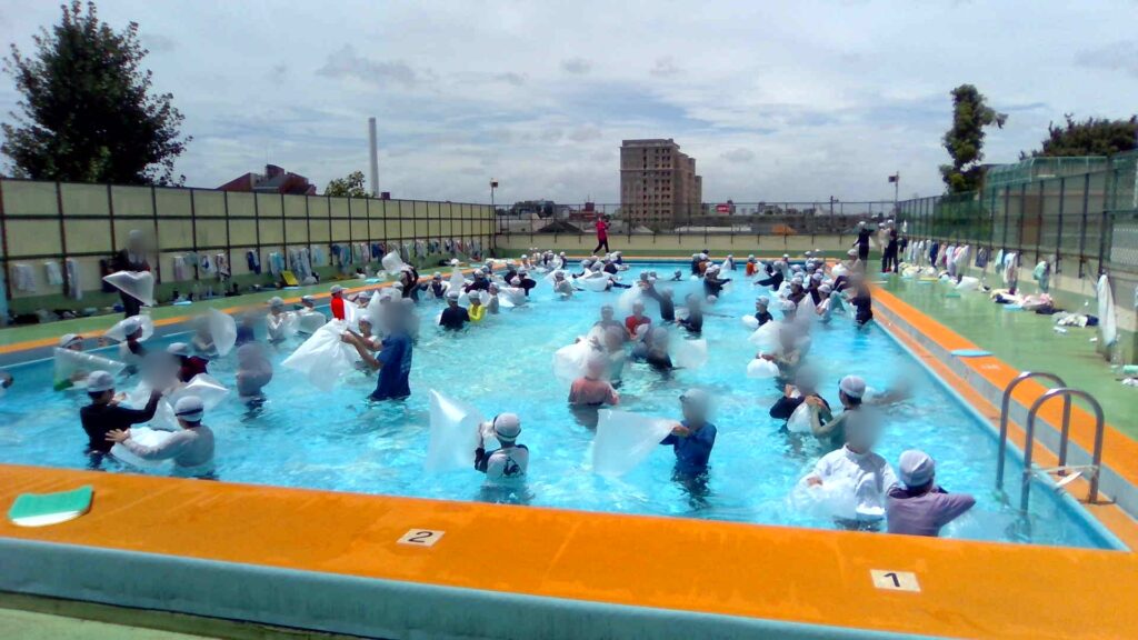 暑すぎても入れず、小雨でも入れず、の状況が今年度も続いておりましたが、17日に予定していた6年生の着衣泳は好天の中行うことができました。水難事故に遭う、水害等に巻き込まれる等、まさかの事態でも、「長い時間浮いていることができる」というスキルはとても重要です。そのための訓練を、まさに身をもって体験することを主眼に置いています。着衣で水の中に入ることがどれだけ困難を伴うのか、これがプールの水のようなきれいで30℃近く水温のある条件の良い水でない場合(低温、泥水等)だとどうなるのか、自分で考え行動することが大事で、着衣泳にはそういう大事な要素が含まれています。